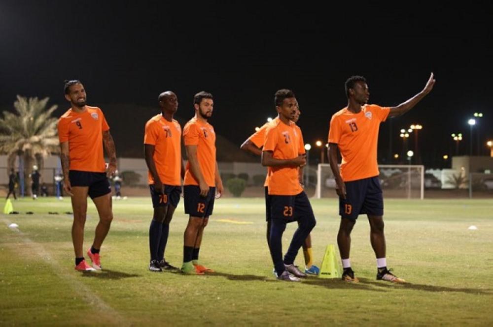 لاعبو الفيحاء خلال مران الأمس استعداداً لمواجهة الاتحاد اليوم
