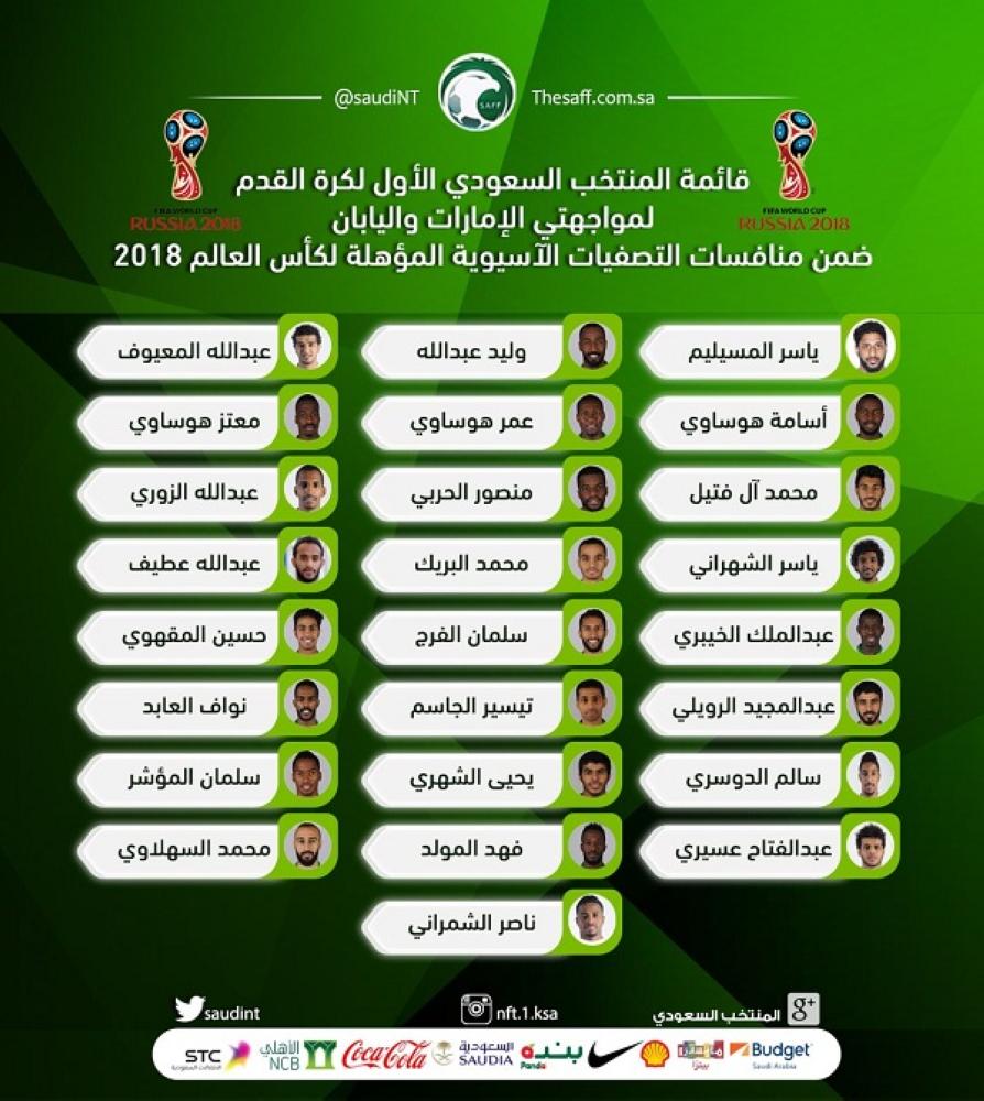 أعلنت إدارة المنتخب السعودي الأول لكرة القدم القائمة المختارة من قبل المدير الفني بيرت فان مارفيك للمشاركة في البرنامج الإعدادي الخاص بمواجهتي الأخضر في الجولة التاسعة أمام منتخب الإمارات في التاسع والعشرين من أغسطس على استاد هزاع بن زايد، والجولة العاشرة أمام منتخب اليابان في الخامس من شهر سبتمبر القادم على استاد مدينة الملك عبدالله الرياضية بجدة "الجوهرة" ضمن منافسات التصفيات الآسيوية المؤهلة لكأس العالم 2018.