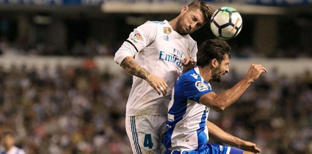 صراع هوائي على الكرة بين المدافع راموس ولاعب ديبورتيفو لاكرونيا بورخا