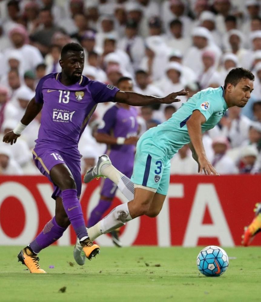 صراع على الكرة بين البرازيلي إدواردو لاعب الهلال، وأحمد برمان لاعب خط وسط نادي العين الإماراتي.