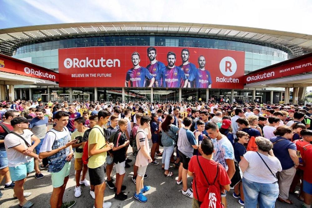 جانب من الحضور الجماهيري لفريق برشلونة أثناء تقديم الأخير لاعبهم الجديد ديمبيلي