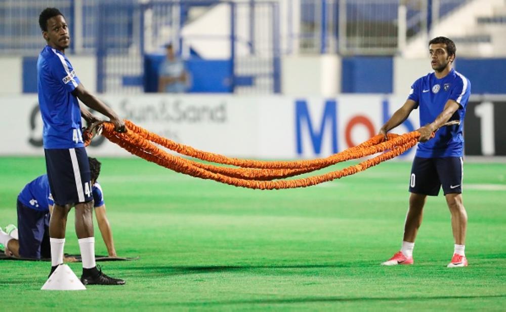 لاعبا الهلال محمد الشلهوب ومختار فلاتة خلال تمرين اللياقة