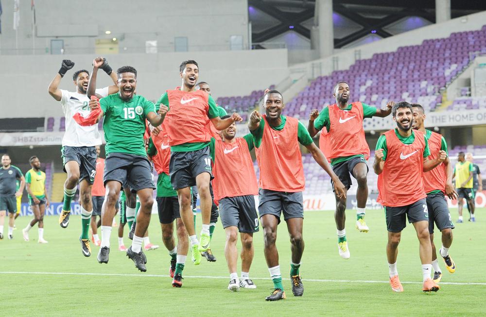 لاعبو المنتخب السعودي يبدون حماسا في مران الأمس. (عكاظ)