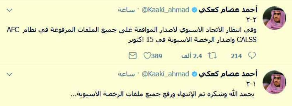 وقال نائب رئيس الاتحاد كعكي في تغريدتين عبر حسابه الرسمي بموقع التواصل الاجتماعي تويتر: «بحمد الله وشكره تم الانتهاء ورفع جميع ملفات الرخصة الآسيوية، وفي انتظار الاتحاد الآسيوي لإصدار الموافقة على جميع الملفات المرفوعة في نظام (AFC CALSS) وإصدار الرخصة الآسيوية في 15 أكتوبر».