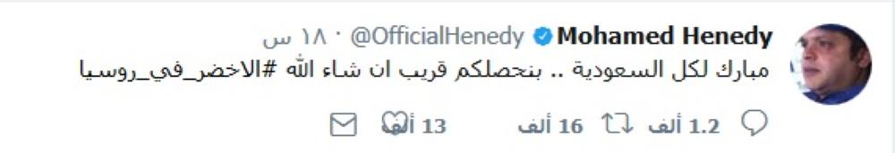 وقدم الممثل المصري محمد هنيدي التهاني للسعودية بمناسبة تأهلها لكأس العالم، حينما كتب تغريدة عبر حسابه الرسمي في «تويتر»: «مبارك لكل السعودية.. بنحصلكم قريب إن شاء الله». فيما كتبت المطربة اللبنانية يارا: «مبروك فوز منتخب السعودية والتأهل إلى مونديال روسيا». وكتب المطرب اللبناني راغب علامة: «في ظل الأخبار السياسية المؤلمة التي نعيشها يوميا يبقى هناك ضوء من الأخبار الجيدة وهو تأهل المنتخب السعودي لكأس العالم. مبروك للسعودية وشعبها».