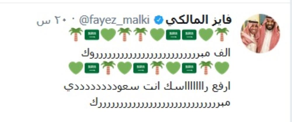 ولم يكن المالكي وحيدا في التصفيق للأخضر بعد فوزه، بل تحولت حسابات عدد كبير من الفنانين السعوديين والعرب إلى اللون الأخضر، متوشحة بأعلام السعودية، وتقديم التبريكات إلى المملكة حكومة وشعبا على الإنجاز الرياضي الكبير الذي يسجل باسم الأمتين العربية والإسلامية.