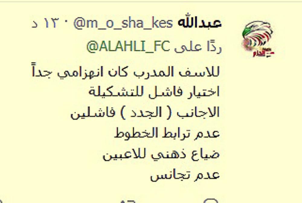 فيما قدمت الجماهير الخضراء وصفة علاج لإنقاذ فريقهم الأول في هذا الموسم الذي اتضح منذ بدايته أن الفريق سيعاني كثيراً، بعد ظهوره بشكل مخجل خلال المنافسات المحلية والخارجية، تلخصت في وجود إداري وفني مع المدرب، ومناقشته حول استبعاده بعض اللاعبين، وإصراره على تكتيك وأسلوب معين لم ينجح حتى هذه اللحظة مع الأهلي، كما طالبت بضرورة انتشال الفريق من الحالة النفسية التي سيتعرض لها اللاعبون بعد الخسارة، وتهيئتهم للقاءات القادمة في الدوري التي ستبدأ من لقاء النصر الأحد القادم.