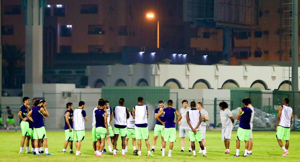 الأوكراني ريبيروف مجتمعا مع اللاعبين في تدريب الفريق أمس.