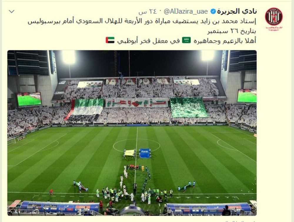 وذلك عقب أن نشر الحساب الرسمي لنادي الجزيرة الإماراتي عبر موقع التواصل الاجتماعي «تويتر» تغريدة جاء نصها: «استاد محمد بن زايد يستضيف مباراة دور الأربعة للهلال السعودي أمام بيرسبوليس بتاريخ 26 سبتمبر أهلا بالزعيم وجماهيره في معقل فخر أبوظبي».