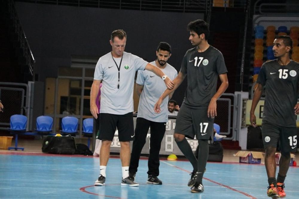 البلجيكي ايفينس هيرمانس مدرب أخضر الصالات في حديث مع اللاعبين