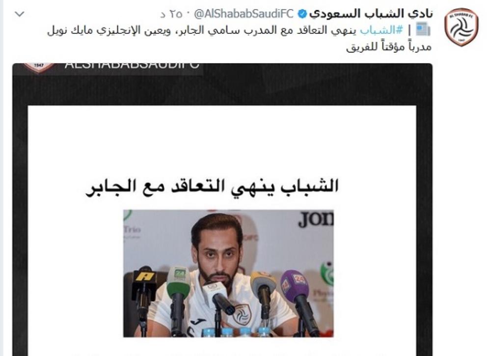 قررت إدارة نادي الشباب إنهاء التعاقد مع المدرب الوطني سامي الجابر من مهمة تدريب الفريق الأول لكرة القدم على أن يتولى المدرب الإنجليزي مايك نويل تدريب الفريق لحين الاتفاق مع مدرب آخر.