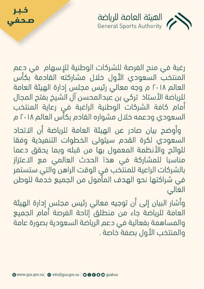 وجه رئيس مجلس إدارة الهيئة العامة للرياضة تركي آل الشيخ بفتح المجال أمام كافة الشركات الوطنية الراغبة في رعاية المنتخب السعودي ودعمه خلال مشواره القادم بكأس العالم 2018م.