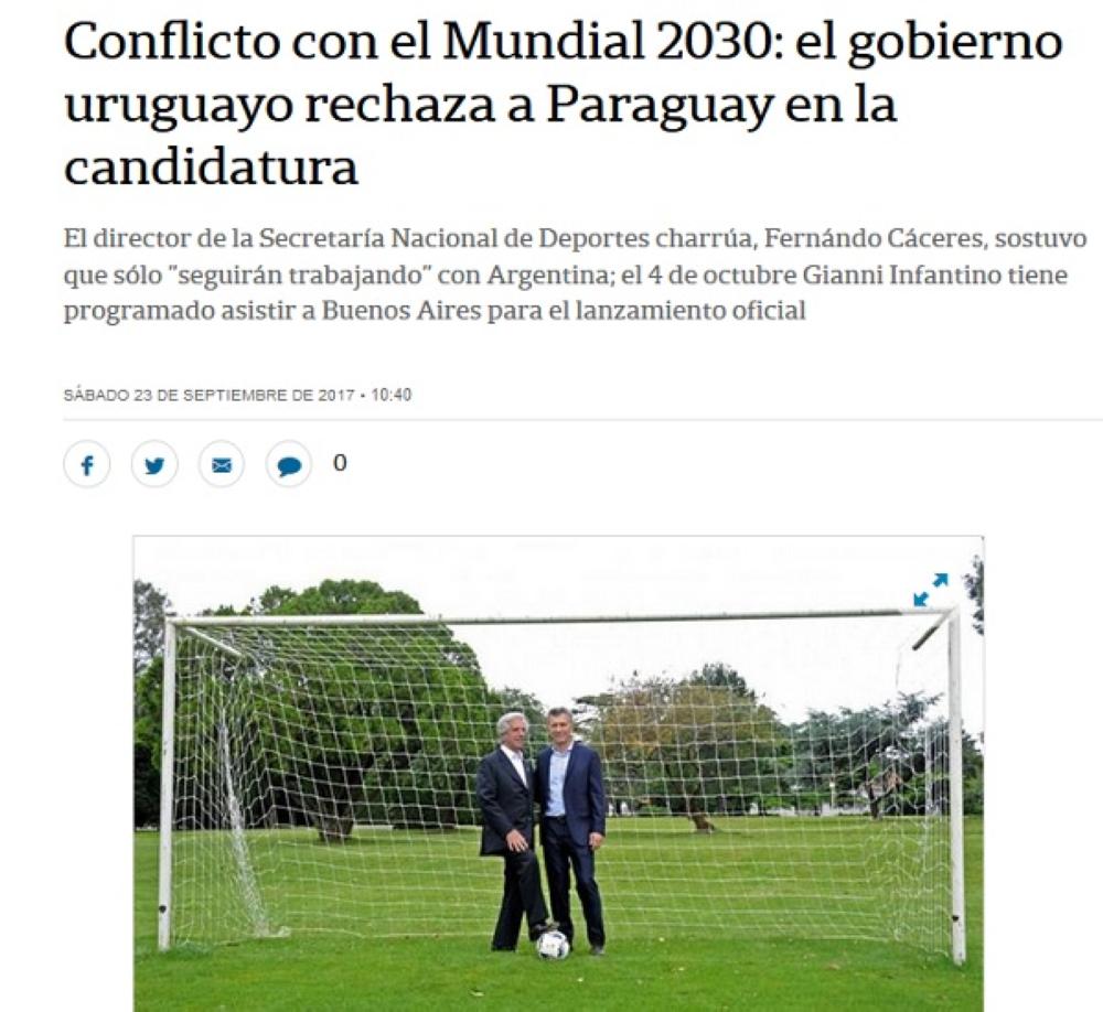 أغضب رئيس دولة الأرجنتين ماوريسيو ماكري نظيره تاباري فازكيز رئيس الأوروغواي، بسبب الدعوة التي وجهها الأول إلى رئيس باراغواي هوراسيو كارتيس لأجل الانضمام إلى الملف المشترك بين البلدين لاستضافة مونديال 2030، وذلك حسب ما نشرته صحيفة «lanacion» التي قالت إن رئيس الأوروغواي هدد بالانسحاب من الاجتماع المقرر في العاصمة بوينوس آيريس لبحث الملف المشترك لاستضافة الحدث العالمي الأبرز عام 2030، في حال دعوة باراغواي.