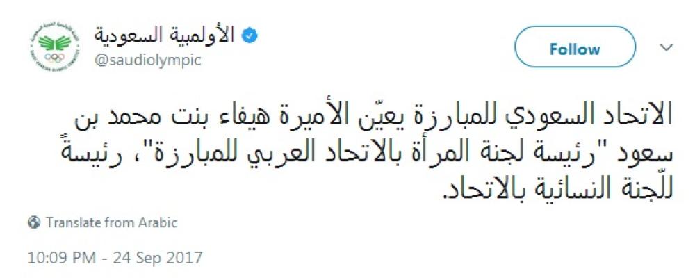 جاء ذلك في تغريدة عبر الحساب الرسمي للجنة الأولمبية العربية السعودية في «تويتر»، إذ قالت: «الاتحاد السعودي للمبارزة يعيّن الأميرة هيفاء بنت محمد بن سعود (رئيسة لجنة المرأة بالاتحاد العربي للمبارزة)، رئيسة للجنة النسائية بالاتحاد».