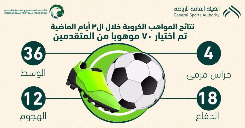 أعلن رئيس هيئة الرياضة السعودية تركي آل شيخ عن 70 موهوبا من مواليد المملكة اختارتهم اللجنة المشكلة التي باشرت أعمالها الأسبوع الماضي، وشكل مركز الوسط الأغلبية الكبرى من المواهب إذ بلغ عددهم 36 لاعبا، وجاء خط الدفاع ثانياً إذ تم اختيار 18 لاعباً، فيما جاء خط الهجوم ثالثاً بـ12 لاعباً، أما الحراسة فسجلت شحاً في المواهب فلم يُختر سوى أربعة حراس فقط.