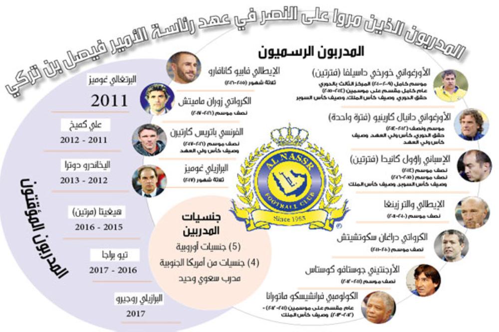 «17» مدربا يمثلون 10 جنسيات من ثلاث قارات على مستوى العالم تولوا إدارة الدفة الفنية للفريق الأول لكرة القدم بنادي النصر في عهد إدارة الأمير فيصل بن تركي الممتدة «9» مواسم.