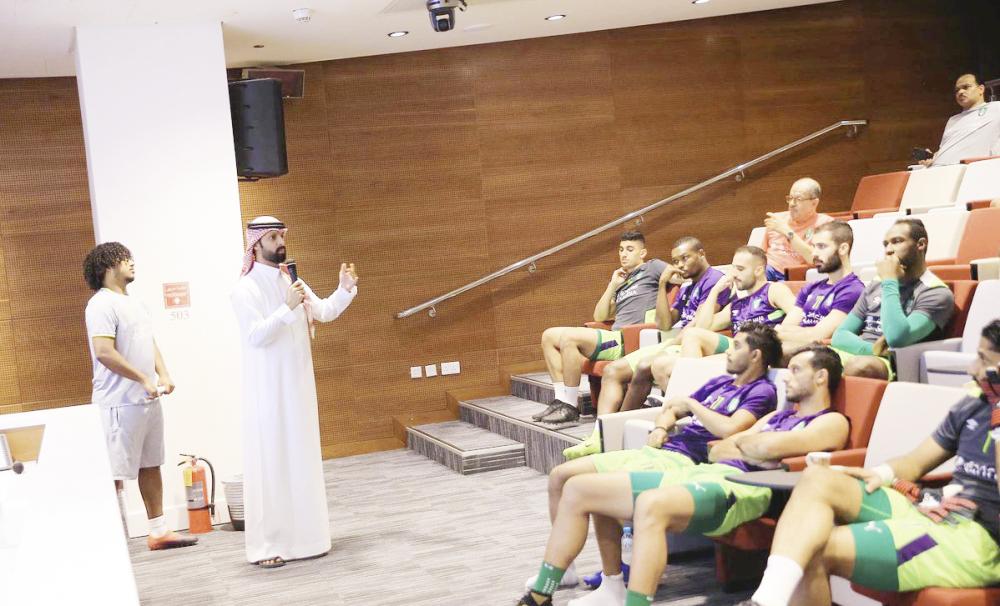 لاعبو الأهلي يستمعون إلى شرح عن التنظيمات الإدارية. (عكاظ)