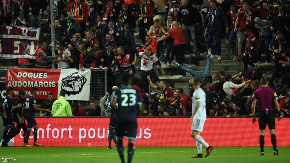 وسقط العشرات من مشجعي فريق ليل من مسافة حوالى متر ونصف متر على أرض الملعب.