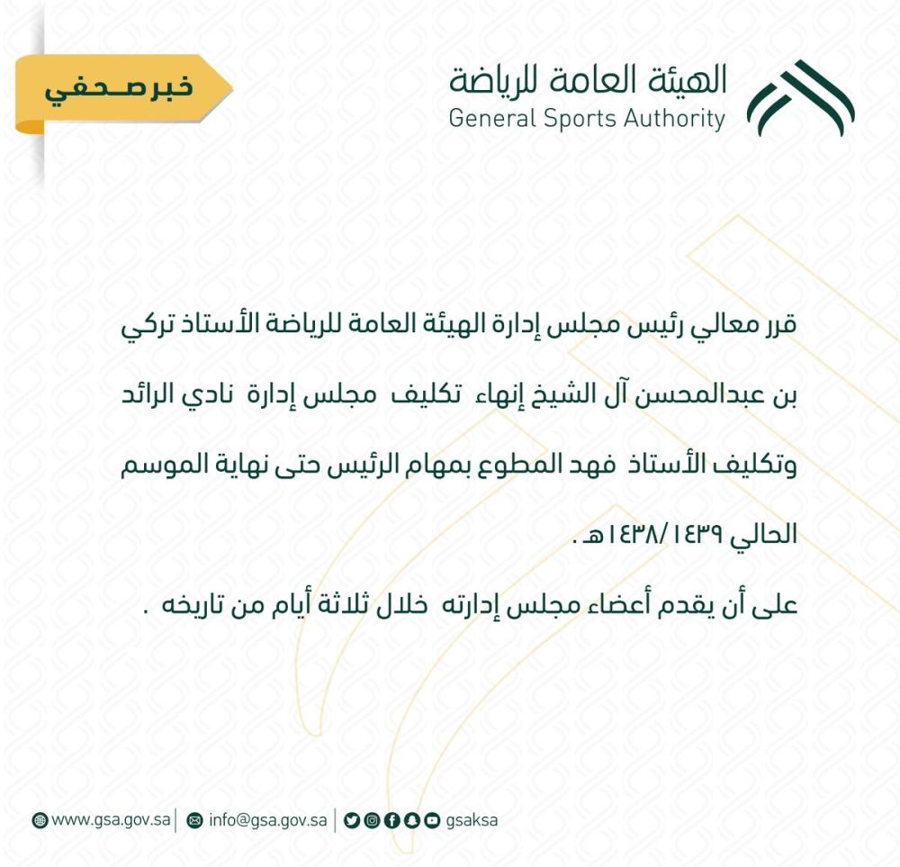 قرر رئيس مجلس إدارة الهيئة العامة للرياضة تركي بن عبدالمحسن آل الشيخ إنهاء تكليف مجلس إدارة نادي الرائد وتكليف فهد المطوع بمهمات الرئيس حتى نهاية الموسم الحالي 1439/1438هـ، على أن يقدم أعضاء مجلس إدارته خلال ثلاثة أيام من تاريخه.