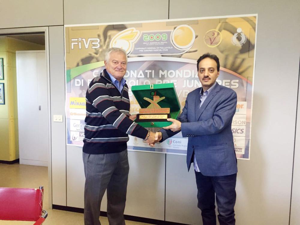 آل هتيلة يسلم نائب رئيس اتحاد الطائرة الإيطالي درعا تذكارية.