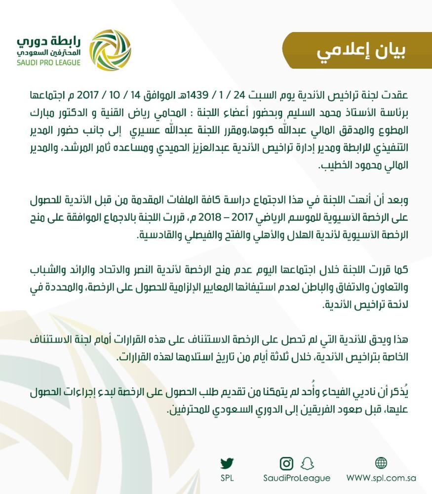وبعد أن أنهت اللجنة في هذا الاجتماع دراسة كافة الملفات المقدمة من الأندية للحصول على الرخصة الآسيوية للموسم الرياضي 2017 – 2018، قررت اللجنة بالإجماع، الموافقة على منح الرخصة الآسيوية لأندية (الهلال، والأهلي، والفتح، والفيصلي، والقادسية).