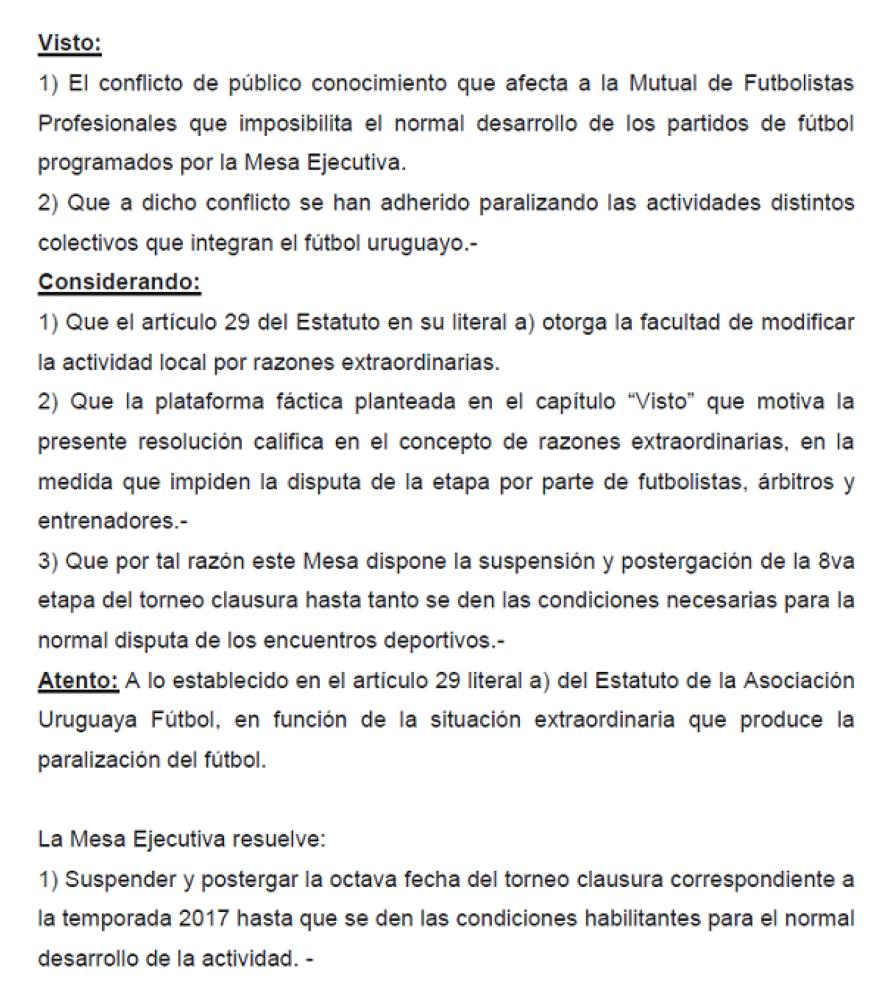 قرر مجلس رابطة دوري كرة القدم في الأوروغواي، والمكون من رؤساء أندية الدوري، تعليق مباريات البطولة وعدم استئنافها لحين انتهاء إضراب اللاعبين.
