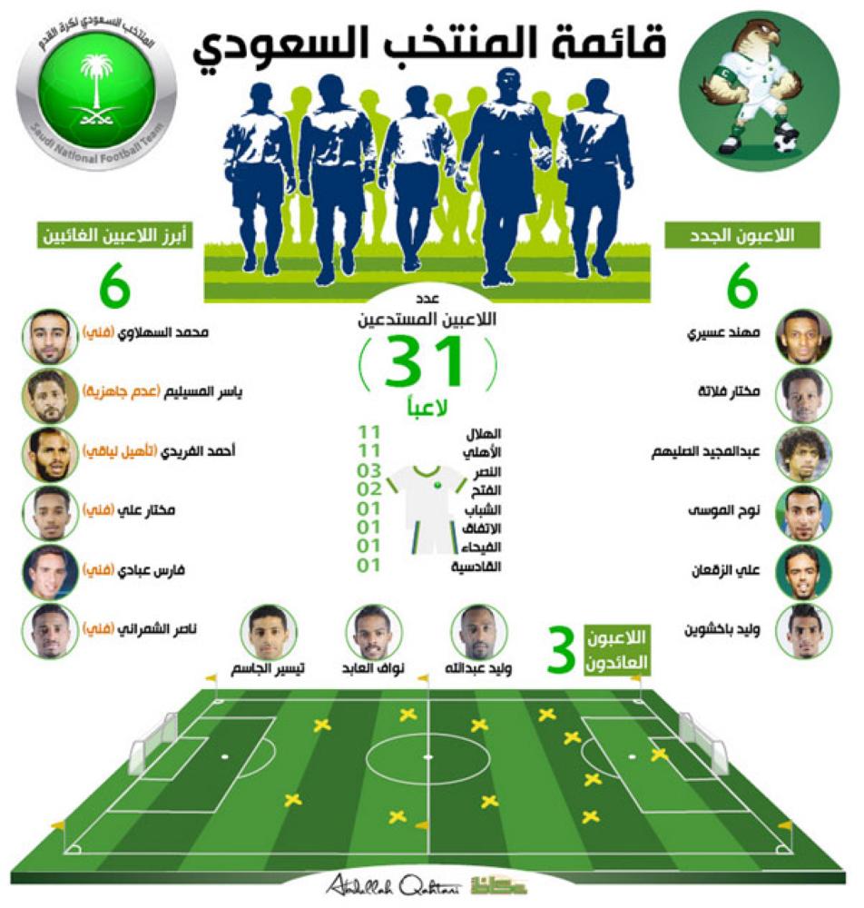 وضمت القائمة التي أعلن عنها مساء أمس كلا من: وليد عبدالله، عبدالله المعيوف، محمد العويس في حراسة المرمى. أسامة، وعمر، ومعتز هوساوي، ومحمد آل فتيل، وعبدالله الحافظ، ومحمد البريك، وحسن معاذ، ومنصور الحربي، وياسر الشهراني، وسعيد المولد، وعبدالرحمن العبيد في الدفاع.
