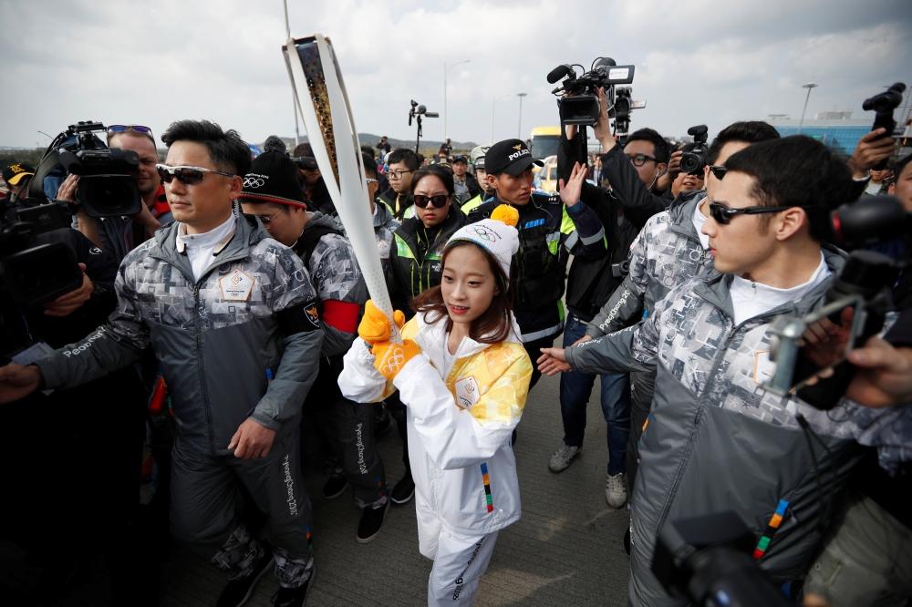 وحمل دو جونج هوان وزير الرياضة الكوري وكيم يونا، بطلة التزلج على الجليد في ألعاب فانكوفر 2010، الشعلة بعد رحلة جوية كورية من اليونان بعد تسليم الشعلة لمنظمي ألعاب 2018 في حفل أمس (الثلاثاء).