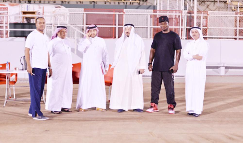 رئيس الوحدة مع بعض منسوبي النادي في تدريب الفريق أمس. (عكاظ)