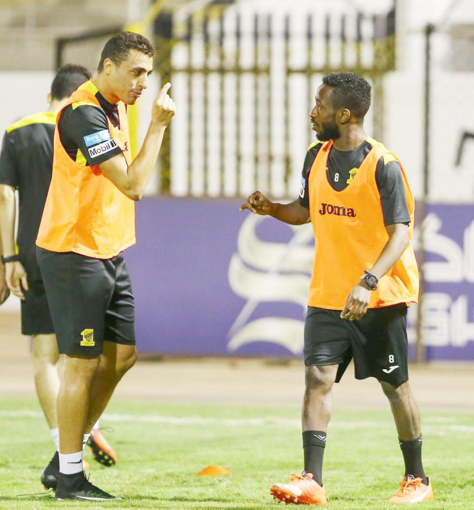 المولد وعكايشي في تدريبات الاتحاد أمس. (عكاظ)