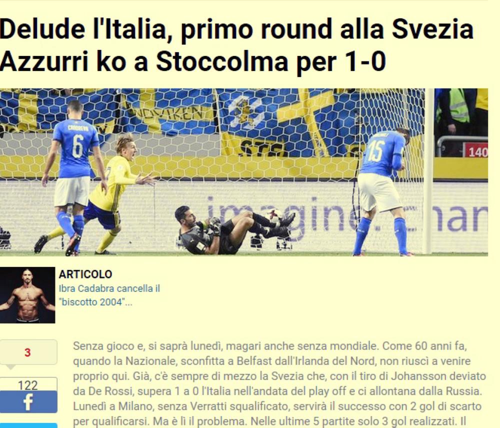 وانتقدت الصحيفة في صفحاتها الداخلية منتخب إيطاليا «سيئا وخجولا وبطيئا»، سائلة «بعد 90 دقيقة، نهاية العالم؟».