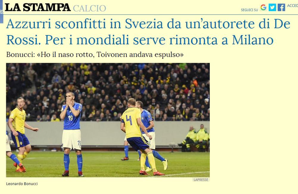 وجهت الصحف الإيطالية (السبت) انتقادات لاذعة لمنتخب بلادها، بعد الخسارة بهدف دون مقابل أمام ضيفه السويدي، في الملحق المؤهل إلى كأس العالم في كرة القدم 2018. وعنونت صحيفة «لا ستامبا» أن المنتخب كان أشبه بـ«كابوس»، ولم تكن لديه فكرة «ماذا يفعل» في مباراة أمس الأول، بينما دعت «توتو سبورت» على صفحتها الأولى إلى «الكف عن الأعذار!». وأضافت الصحيفة اليومية: «الآن عليكم أن تتفادوا كارثة تاريخية»، معتبرة أن إيطاليا كانت «صغيرة، صغيرة جدا» في مباراة أمس الأول.
