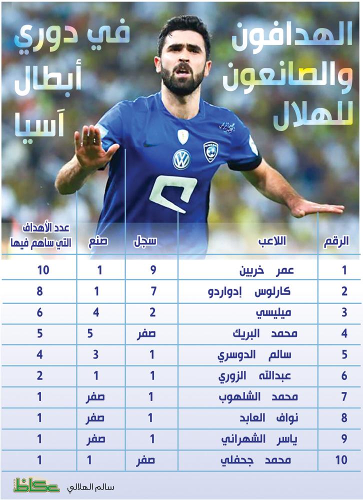 وأسهم خربين مع إدواردو في 70% من الأهداف التي سجلها الأزرق في مشواره بالبطولة، إذ سجل هداف البطولة حتى الآن عمر خربين تسعة أهداف وصنع هدفا وحيدا؛ بمعنى إسهامه بـ45% من أهداف الهلال، فيما سجل كارلوس سبعة أهداف وصنع هدفا وحيدا.