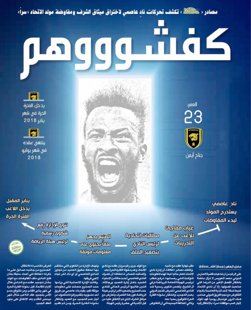 المصادر نفسها كشفت لـ«عكاظ» توصل رئيس الاتحاد الحالي حمد الصنيع لاتفاق مع وكيل أعمال المولد الدكتور منصور اليامي على بنود العقد الجديد الذي سيتم توقيعه بين الطرفين، الذي ستراوح مدته من ثلاث إلى أربع سنوات قادمة، إذ حرصت الإدارة المكلفة على التجديد مع المولد عقب تلقي الاتحاديين معلومات مؤكدة تفيد أن ناديا عاصميا يسعى لضم اللاعب لصفوفه بعد علمه باقتراب المولد من الفترة الحرة، وتقديم إغراءات له من أجل عدم التجديد مع ناديه، مخترقا بذلك ميثاق الشرف الموقع عليه من جانب 14 ناديا في حضرة رئيس الهيئة العامة للرياضة، كما انفردت «عكاظ» بذلك في عددها الصادر الخميس الماضي تحت عنوان «كفشوووهم»، الذي أحدث ضجة كبيرة في الوسط الرياضي، وكان محل نقاش القنوات الفضائية ومواقع التواصل الاجتماعي.