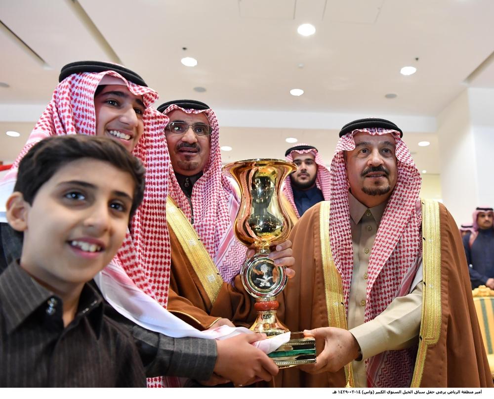نيابة عن خادم الحرمين الشريفين الرئيس الفخري لنادي الفروسية توج أمير منطقة الرياض الأمير فيصل بن بندر، أمس، الجواد «الأهيب» لأسطبل الأمير فيصل بن خالد بن عبدالعزيز بكأس الوفاء للأمير محمد بن سعود الكبير - رحمه الله - (فئة 2) بعد تحقيقه المركز الأول في حفلة سباق الخيل السنوي الكبير الذي أقيم بميدان الملك عبدالعزيز للفروسية بالجنادرية، إذ تسلم الكأس من أمير الرياض المشرف الإداري على الأسطبل سعد بن مشرف.