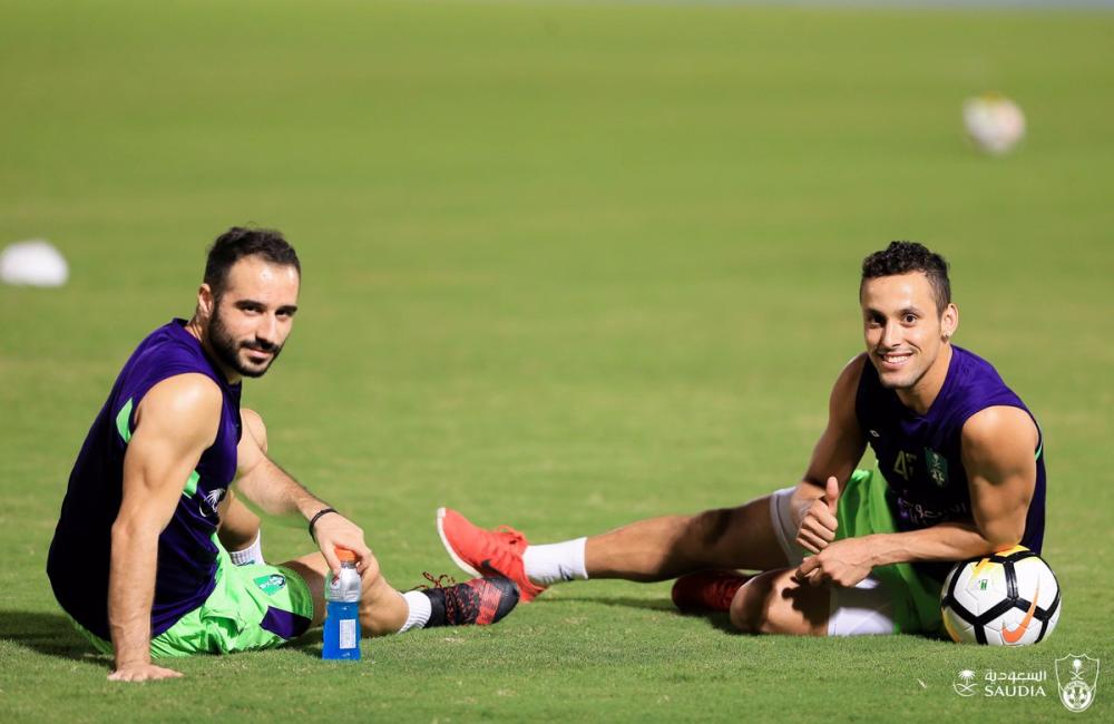 فيتفا وليوناردو في تدريب الأهلي أمس. (عكاظ)