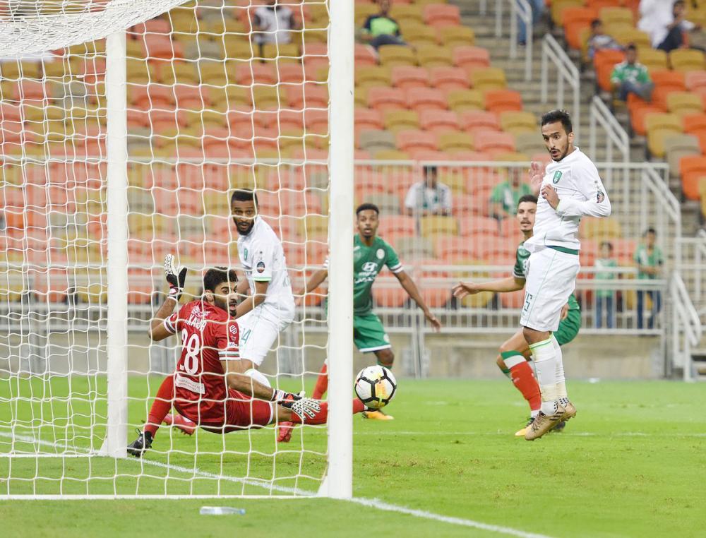 مهند عسيري لحظة تسجيله الهدف الثاني لفريقه في مرمى الاتفاق. (عكاظ)