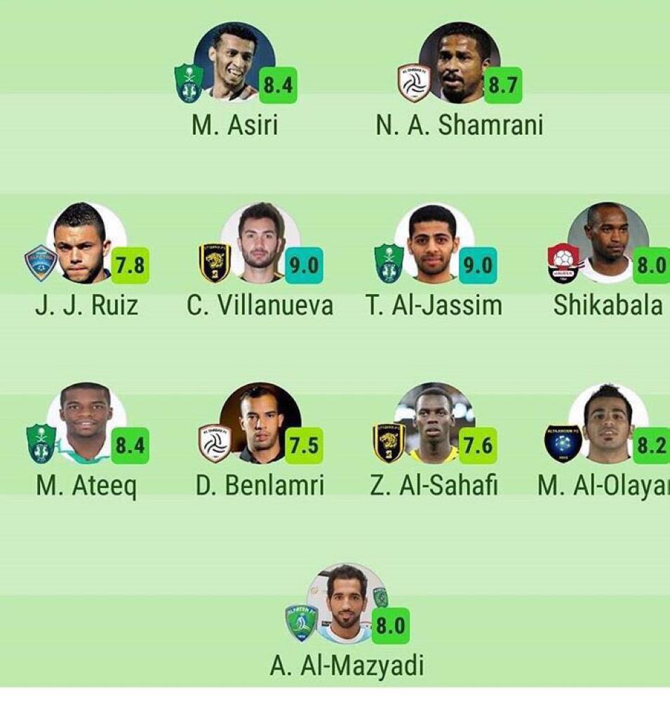 وحصل لاعب الاتحاد التشيلي فيلانويفا على الأفضلية في الجولة مناصفة مع قائد الأهلي تيسير الجاسم؛ إذ وصل تقييمهما لـ9.0 من 10، فيما حصل على أقل تقييم في لاعبي الجولة مدافع الشباب الجزائري جمال بلعمري بـ7.5.