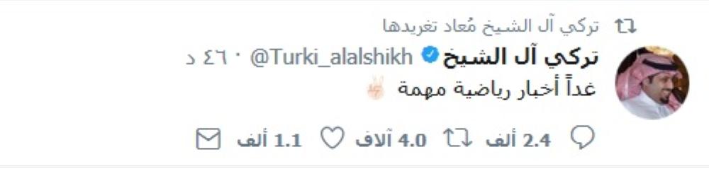 لفتت تغريدة للمستشار في الديوان الملكي ورئيس مجلس إدارة الهيئة العامة للرياضة رئيس اللجنة الأولمبية العربية السعودية تركي آل الشيخ، أنظار كافة الجماهير الرياضية السعودية اليوم (السبت) عبر حسابه الرسمي بموقع التواصل الاجتماعي (تويتر) أعلن فيها عن أخبار رياضية مهمة اليوم، وجاءت ردة فعل كبيرة وواسعة في تويتر من الجماهير الذين تمنوا معرفة التفاصيل الحقيقية خلف تغريدته.