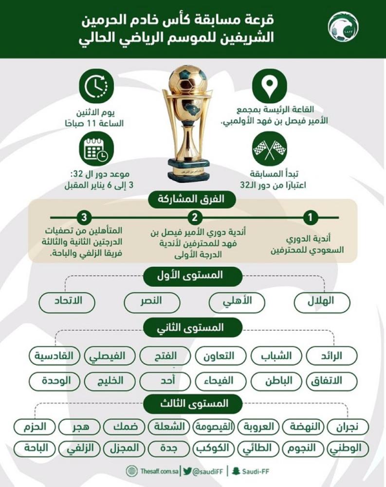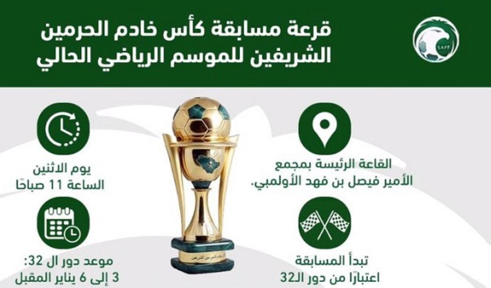 تسحب صباح غد (الاثنين) في القاعة الرئيسية بمجمع الأمير فيصل بن فهد الأولمبي بالرياض قرعة مسابقة كأس خادم الحرمين الشريفين للموسم الرياضي الجاري، بمشاركة 32 فريقا.
