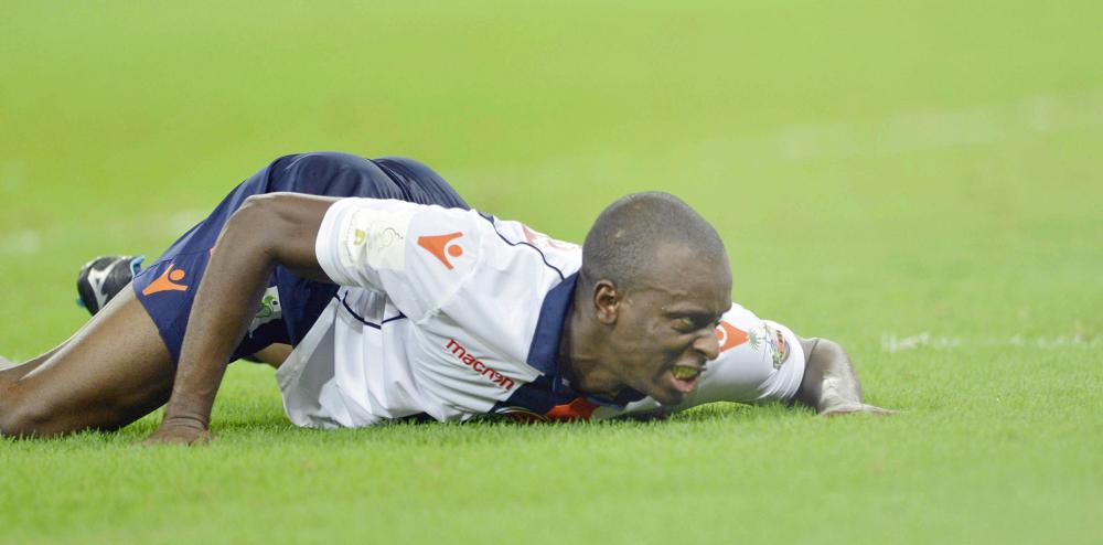 مهاجم الفيحاء أسبريا يحتفل بطريقته بالهدف الذي أحرزه في شباك الاتحاد أمس. (تصوير: ناصر محسن)