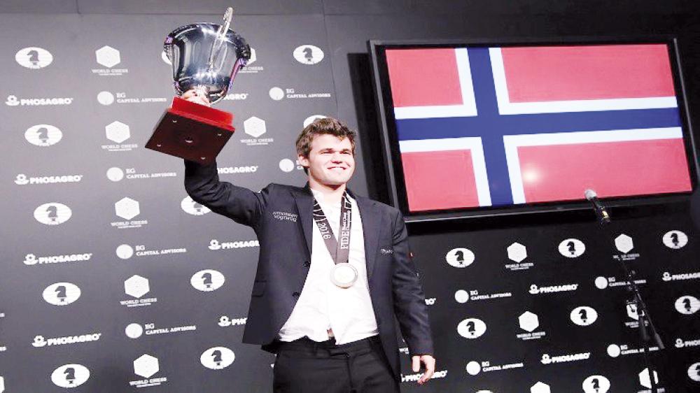 بطل العالم في الشطرنج النرويجي ماغنوس كارلسن يرفع الكأس.