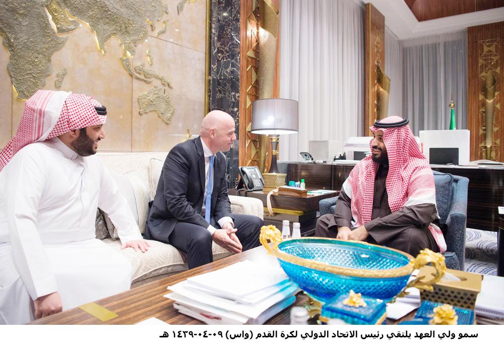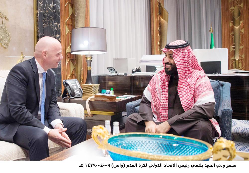 بحث ولي العهد نائب رئيس مجلس الوزراء وزير الدفاع الأمير محمد بن سلمان، مع رئيس الاتحاد الدولي لكرة القدم (فيفا) جياني إنفانتينو، مبادرات الاتحاد الدولي لكرة القدم، وأوجه التعاون الثنائي بين الهيئة العامة للرياضة في المملكة والفيفا، والفرص الواعدة.