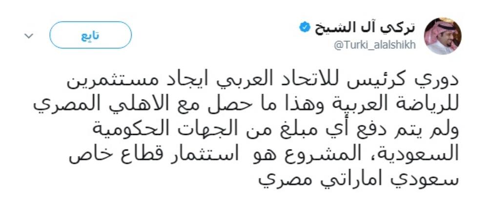 وجاء في تغريدة آل الشيخ: «دوري كرئيس للاتحاد العربي إيجاد مستثمرين للرياضة العربية، وهذا ما حصل مع الأهلي المصري، ولم يتم دفع أي مبلغ من الجهات الحكومية السعودية، المشروع هو استثمار قطاع خاص سعودي/إماراتي/مصري».