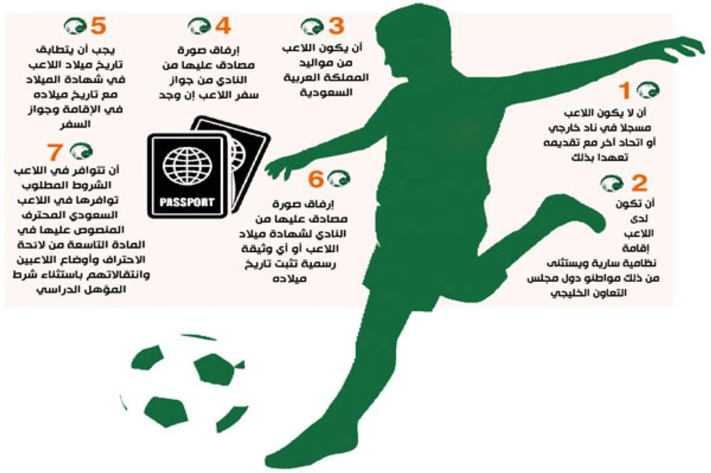وووضع اتحاد اللعبة 7 اشتراطات لأجل السماح بتسجيل اللاعبين من «مواليد السعودية» لأندية دوري المحترفين السعودي، بدءا من فترة الانتقالات الشتوية القادمة.
