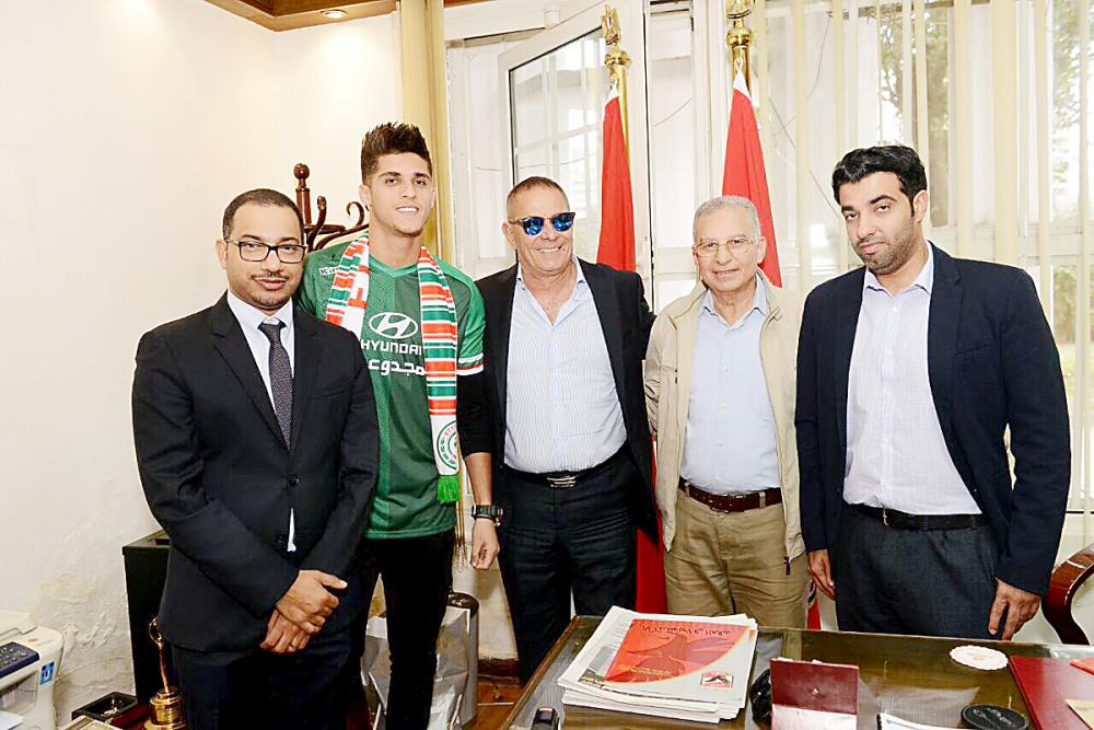 أحمد الشيخ مرتدياً قميص الاتفاق بعد التوقيع معه وبجانبه خالد الدبل.