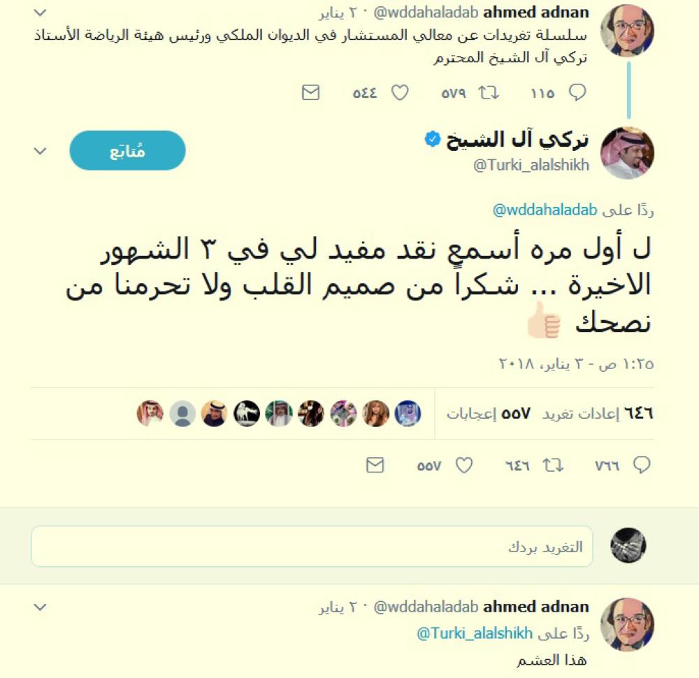 استقبل رئيس مجلس إدارة الهيئة العامة للرياضة تركي آل الشيخ سلسلة تغريدات الصحفي أحمد عدنان بصدر المسؤول الذي يهمه في المقام الأول تطوير الرياضة في المملكة، وذلك بعد أن رد على انتقاداته بالقول: لأول مرة أسمع نقدا مفيدا لي في الأشهر الثلاثة الأخيرة.. شكراً من صميم القلب ولا تحرمنا من نصحك، ليعود الزميل عدنان بالرد عليه قائلاً: هذا العشم. ذلك الأمر أوجد ردود فعل إيجابية من رد آل الشيخ حول نقد الصحفي أحمد عدنان، وكان الصحفي أحمد عدنان كتب عبر حسابه الرسمي بموقع التواصل الاجتماعي تويتر ما نصه: سلسلة تغريدات عن المستشار في الديوان الملكي رئيس هيئة الرياضة تركي آل الشيخ المحترم، كما كتبت نهارا، أن خروج الأمير خالد بن عبدالله في فترته علامة سلبية، أضيف: تراجع سقف الإعلام الرياضي علامة سلبية أخرى، حسب علمي، فإن معاليه يرحب بالنقد البناء، وهذا ما يجب أن يكون، لكن السؤال الآن أوجهه أين الإعلام الرياضي الذي حظي -تاريخيا- بسقف حرية مرتفع.