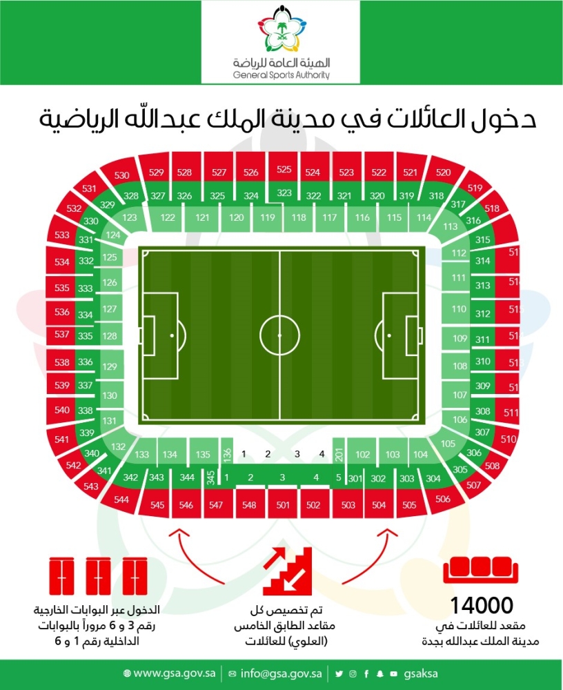 وكشفت هيئة الرياضة عن آلية دخول العائلات في الملاعب الثلاثة، إذ سيكون دخول العائلات في إستاد مدينة الملك عبدالله الرياضية بجدة (الجوهرة) عبر البوابات الخارجية رقم 3 و 6 مروراً بالممرات الداخلية رقم 1 و 6، إذ تم تخصيص الطابق الخامس (العلوي) كاملاً لهذه الفئة بسعة إجمالية قدرها 14000 مقعد.