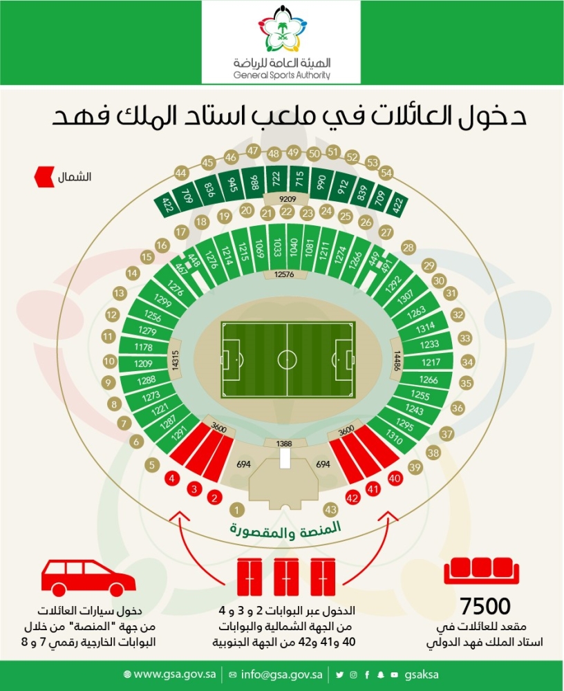 أما في إستاد الملك فهد الدولي بالعاصمة الرياض فسيكون دخول سيارات العائلات من جهة «المنصة» من خلال البوابات الخارجية رقمي 7 و 8، إذ تم توزيع المقاعد المخصصة لهم والبالغة 7500 مقعد في جهتين «الشمالية» عبر البوابات 2 و 3 و 4 و «الجنوبية» من خلال البوابات 40 و41 و42.
