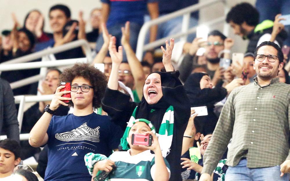 سيدة تحتفل بفوز فريقها الاهلي مع ابنائها في اول حضور لهم في مدرجات الجوهرة. (أ.ف.ب)
